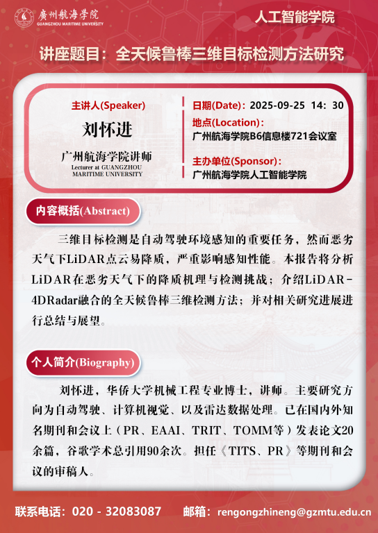 学术讲座预告:刘怀进《全天候鲁棒三维目标检测方法研究》