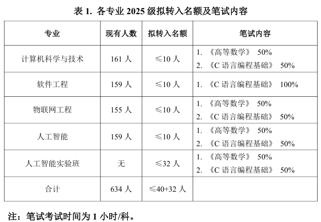 三、转入专业提供的名额、考核方案及时间段人工智能学院转专业工作领导小组依据学校相关文件精神,经综合研判,现将2026年院内各专业接收转入名额及考核安排公布如下: